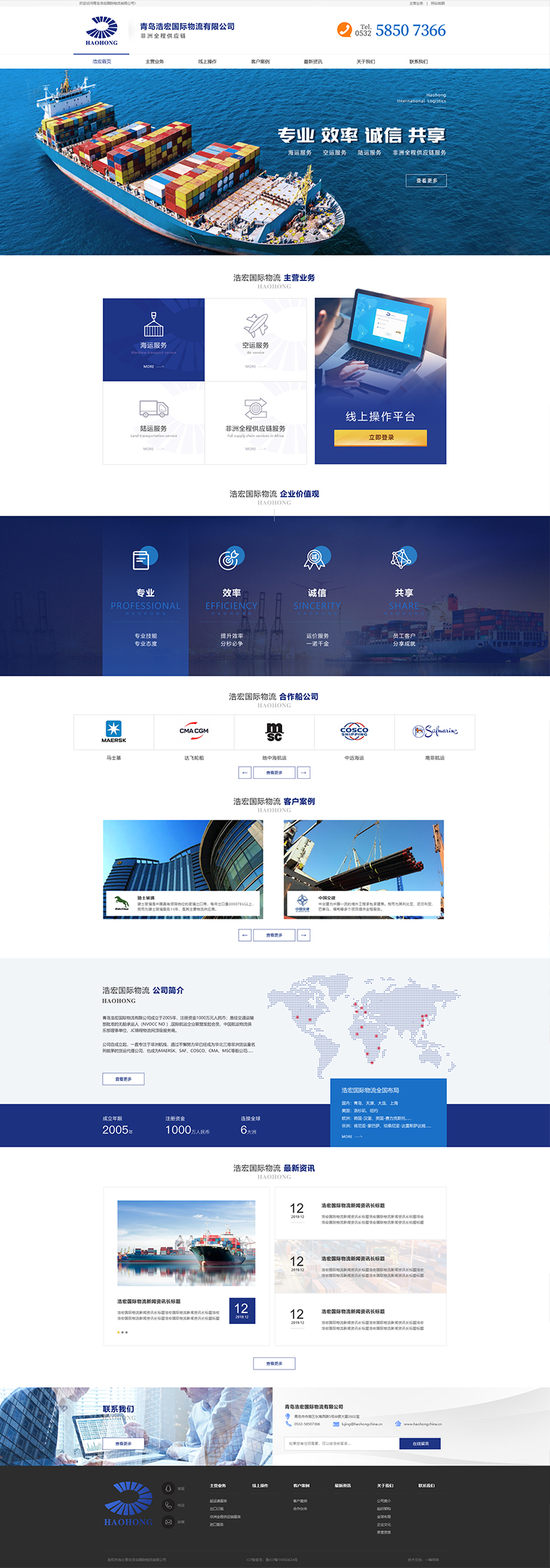 青島浩宏國際物流有限公司成立于2005年,注冊資金1000萬元人民幣;是經交通運輸部批準的無船承運人(NVOCC NO:MOC-NV-07032),國際航運企業(yè)聯盟發(fā)起會員,中國航運物流俱樂部理事單位,JC錦程物流網頂級服務商。 公司自成立起,一直專注于非洲航線,通過不懈努力早已經成為華北三港非洲貨運量名列前茅的貨運代理公司,也成為MAERSK、SAF、COSCO、CMA、MSC等船公司的核心代理。隨著市場發(fā)展和客戶需求的不斷升級,公司在非洲設立了分支機構,成立報關行和陸運公司,為客戶提供完善的全程物流運輸方案,且已服務了眾多國內客戶。